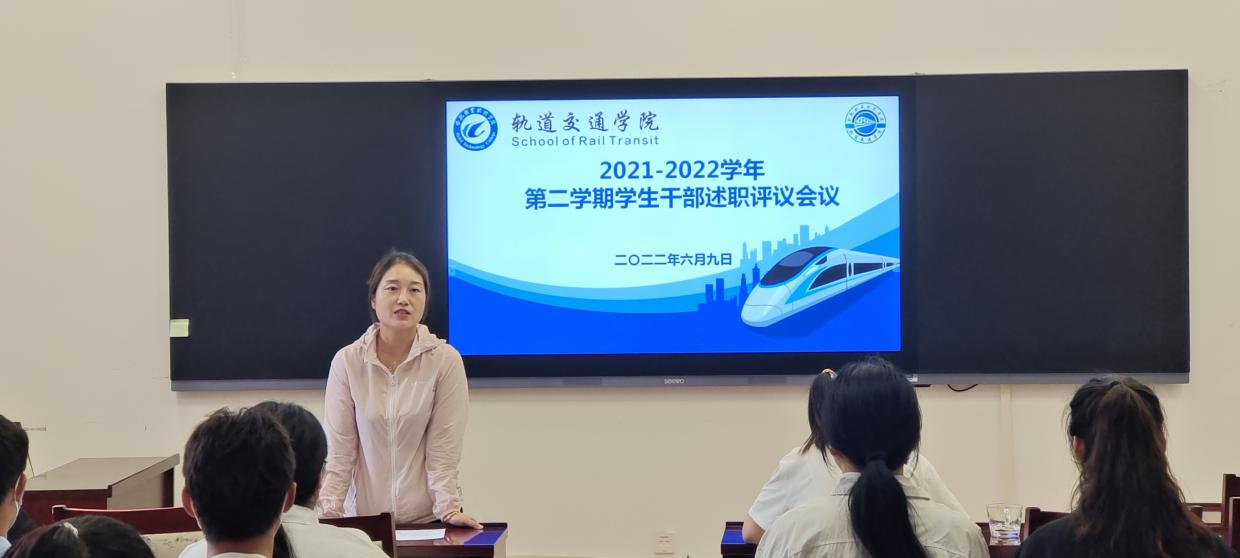 beat365在线唯一官网团总支学生副书记及各部门负责同学围绕2021-2022学年第二学期学生会运行、活动开展依次进行了述职。本学期,beat365在线唯一官网学生会团总支开展了迎新生志愿服务、团体操大赛、轨道交通运营礼仪大赛、疫情防控志愿服务等系列活动,学生干部们积极在活动中服务学生、提升自我,在服务中成长,在耕耘中收获。