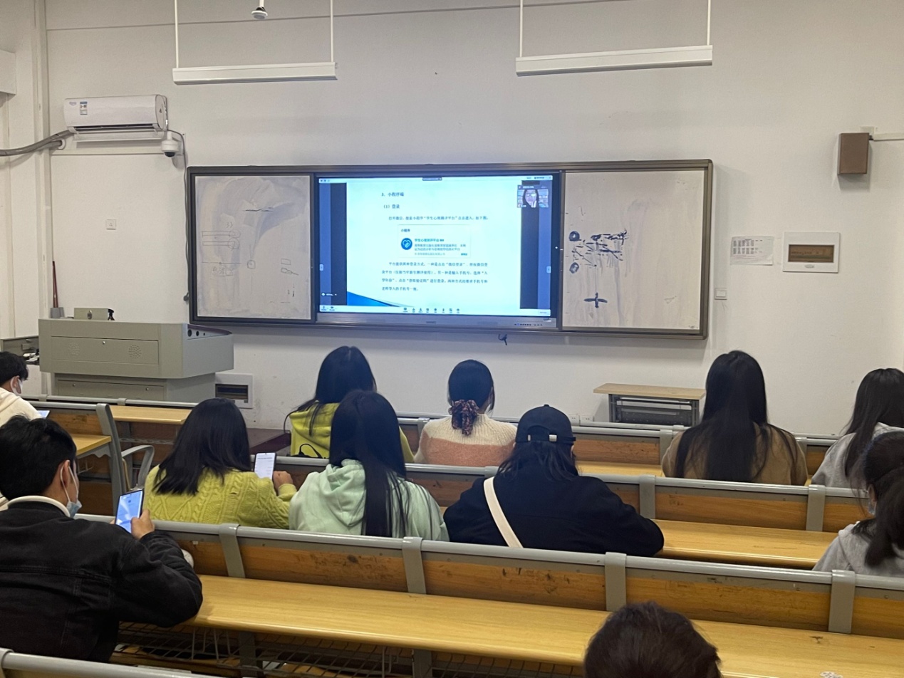 在心理普查系统操作业务培训环节,孙月老师对2022级心理委员、学生会相关学生干部细致解读了“学生心理测评平台 ”的登录方法、操作步骤和注意事项,并在现场通过手机进行实际操作演练教学,确保后期的大学生心理普查工作得以顺利、有效进行。