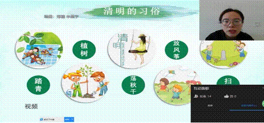 首先,同学们通过视频短片更加清楚地了解了中国传统节日——清明节的由来,以及清明节传统习俗,如扫墓、放风筝、踏青等。活动中,吴明丽老师温馨提醒同学们,清明节期间注意安全,尽量减少外出,外岀佩戴口罩、做好防护,避免参加聚会和集体活动,度过一个文明、平安的节日假期。