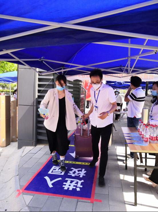 早上八点,各工作组人员全部到位,严格按照学校疫情防控相关要求,做好学生安全返校工作。学生们按照计划时间到达校门口,出示健康码、消毒测温、换戴口罩、间隔排队领取防疫和降暑等物品在内的“健康礼包”,报到现场井然有序。