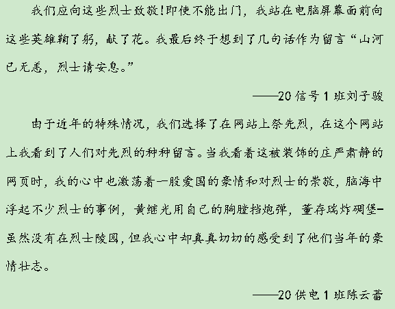 网上祭英烈 留言致哀思。 为缅怀先烈,继承和发扬老一辈革命家的优良传统,beat365在线唯一官网开展清明网上祭英烈系列活动。学生们积极登录中华英烈网站,一起为英烈们点燃清香、献上鲜花、敬献花圈,并向英烈们深深鞠躬,缅怀为民族为国家献出生命的英雄烈士,表达对革命先烈的敬仰之情和继承发扬革命精神的坚定决心。