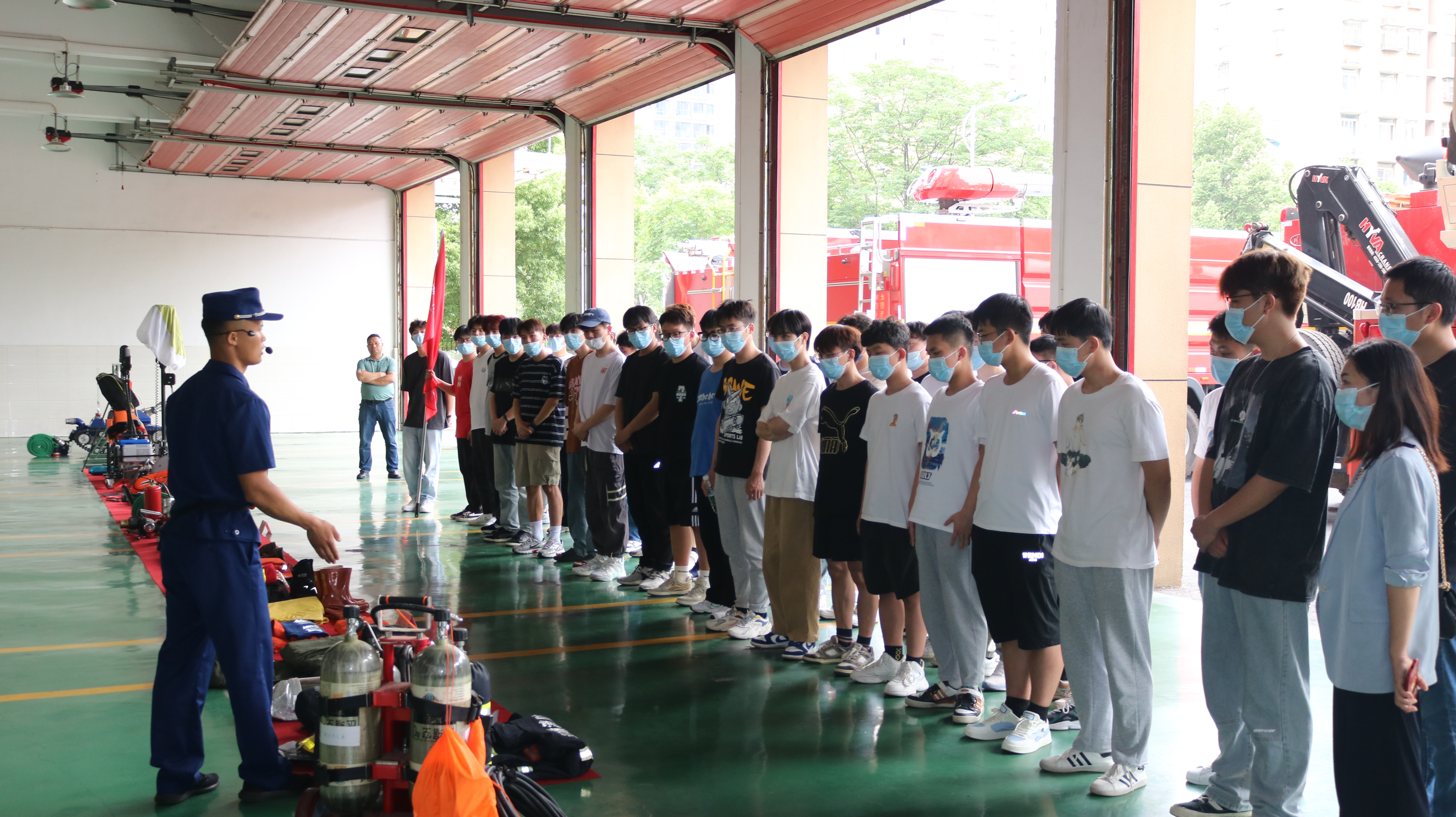 参观过程中,同学们整齐列队由支队指战员带领参观了执勤装备车辆、各类救援器材和支队营房环境,详细介绍了各种车辆以及装备器材的基本性能、功能及用途。随后,大家现场观摩了支队指战员的灭火操法演练。全体指战员良好的精神面貌、有序的队伍管理、整洁支队环境得到了同学们的肯定与赞扬。