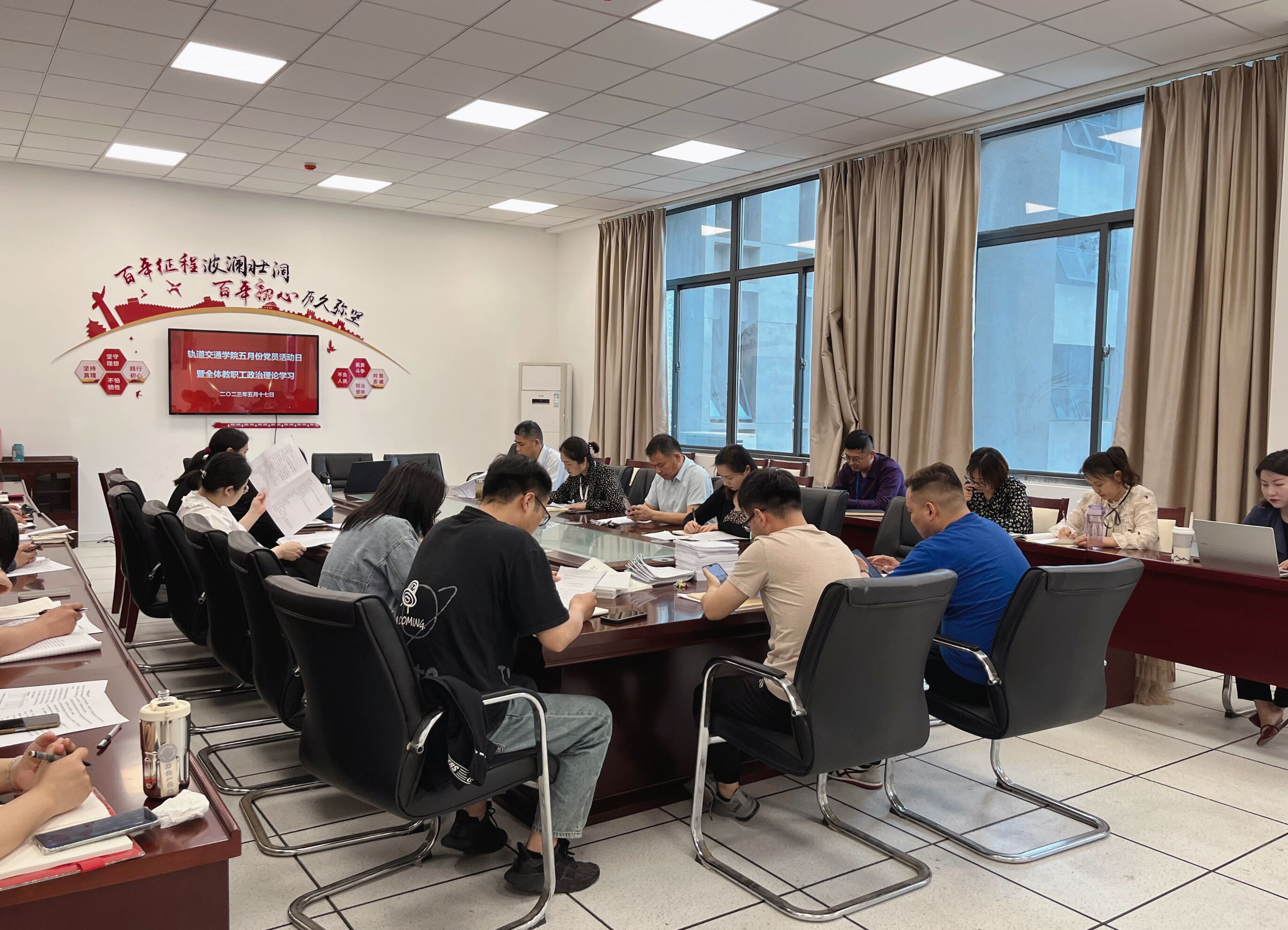 参会人员集中学习了《习近平总书记在学习贯彻习近平新时代中国特色社会主义思想主题教育工作会议上的讲话》《中国共产党普通高等学校基层组织工作条例》等学习材料并观看了优秀党员教育影视片《淬火青春》。