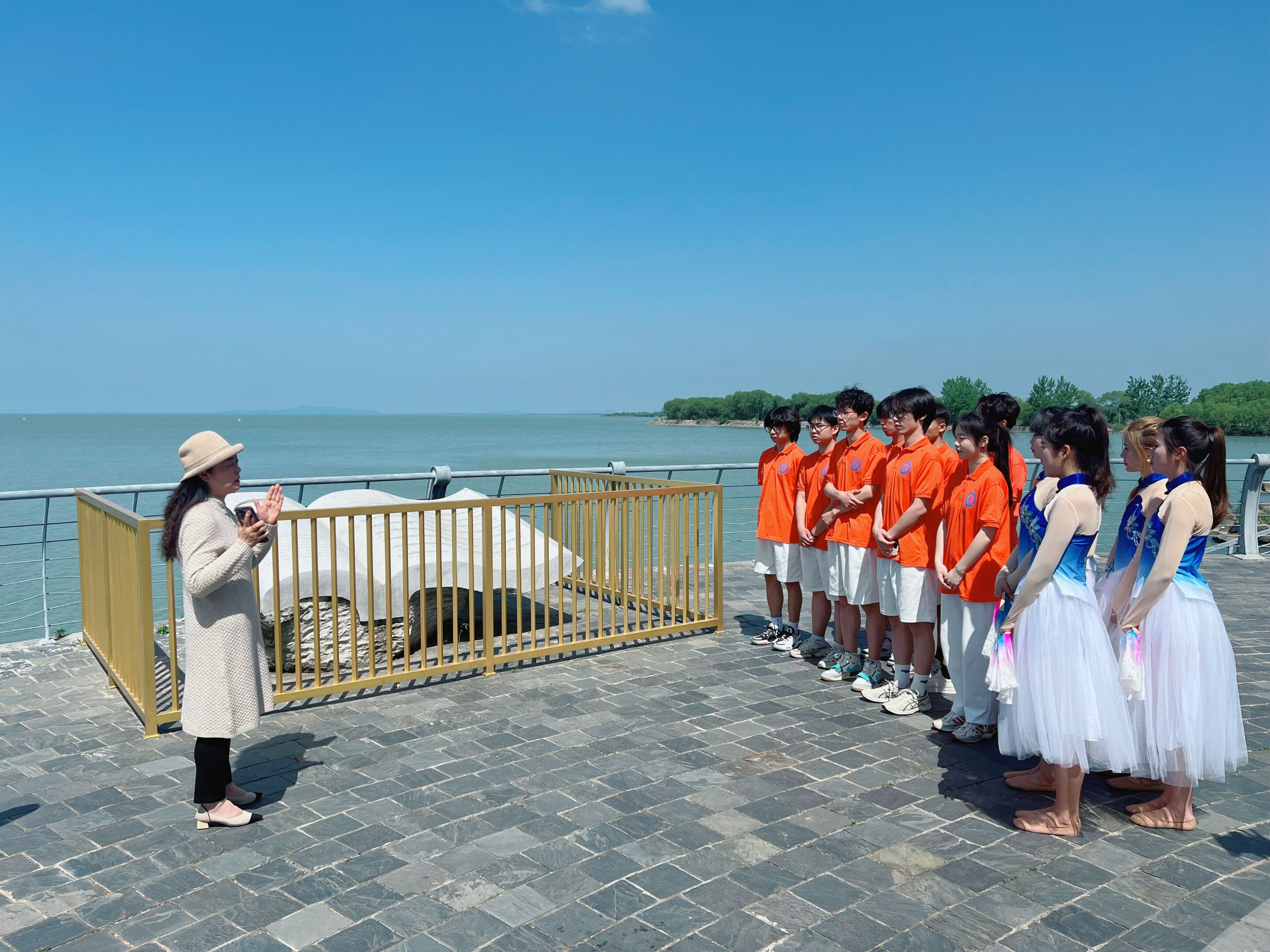 在巢湖龟山公园,李倩老师为大家讲述了著名音乐家李焕之创作的经典巢湖民歌《巢湖好》的创作过程,《巢湖好》具有典型的巢湖地方民歌特色,歌曲悠扬流畅、展现出美丽富饶的巢湖画面,同学们感受到了巢湖民歌的魅力,并在烟波浩渺的巢湖岸边与李倩老师共同演绎了歌伴舞《巢湖好》,通过亲身体验、表演的方式体悟到了传统文化的内涵。