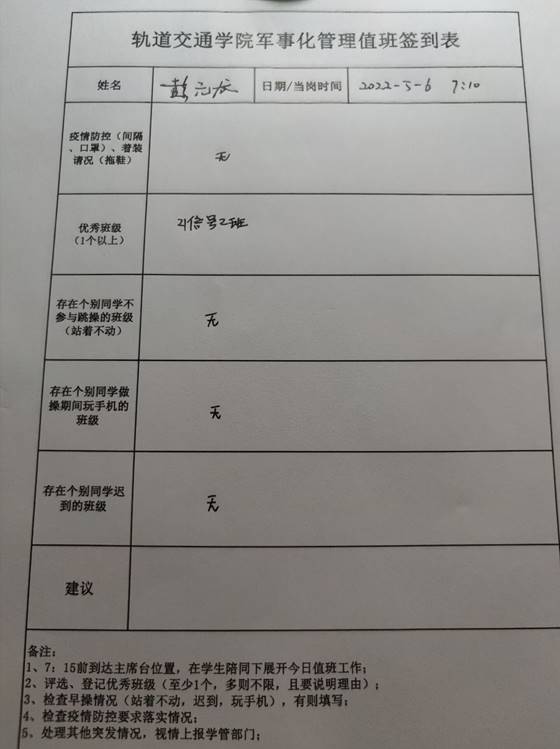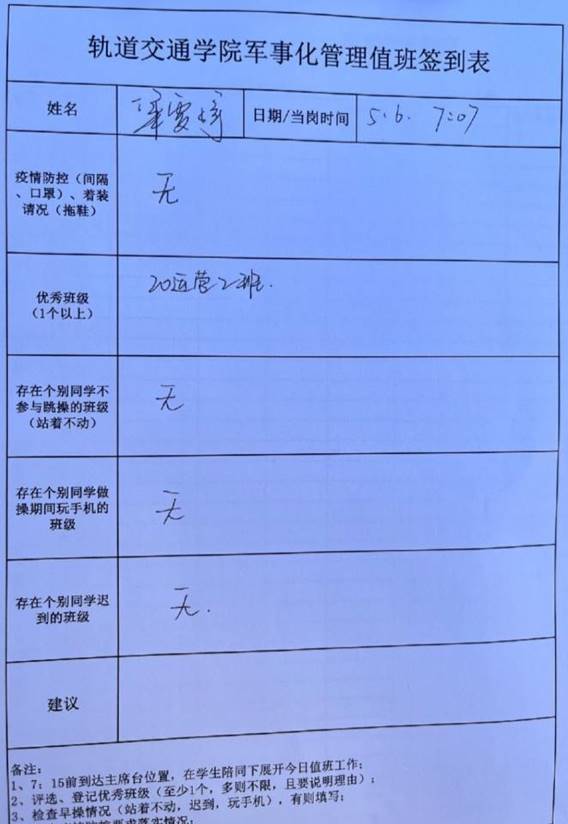 值班记录:今日应出操学生922人,实际出操908人,出操率为98.48%,较下降近0.7个百分点;满勤班级19个,同上期一样,希望能继续保持;出勤率低于90%的班级1个。今日早操整体情况较好,集合速度较快,未发生迟到现象,且同学们针对之前提出的问题都做出了相应的改正,未发现表现较差的班级。较好班级为20运营2班,21信号2班,跳操时动作较为充分、统一,精神状态和班级纪律较好,出勤率高;情况反馈:无。