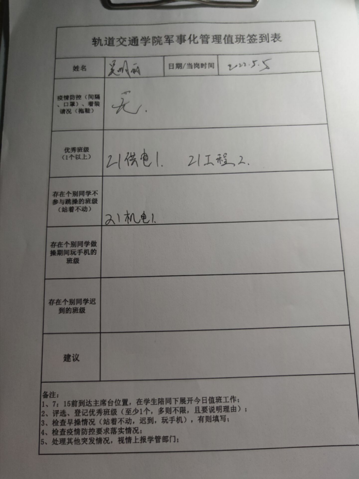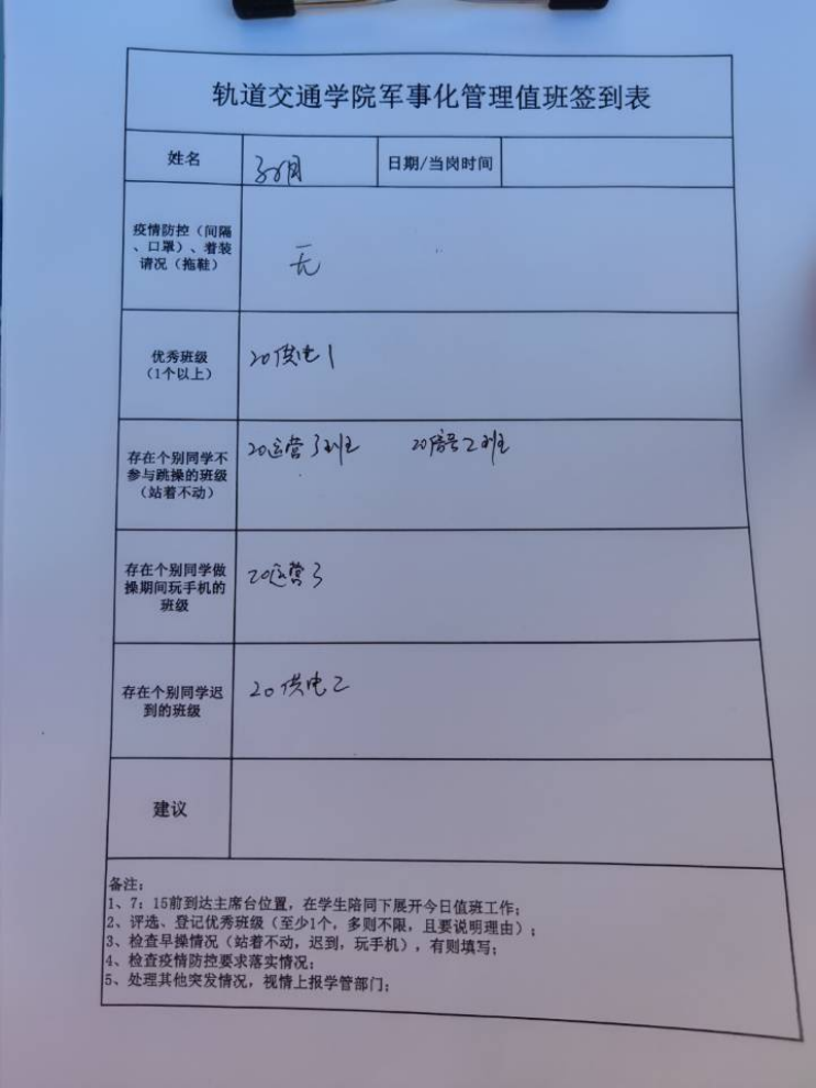 值班记录:今日应出操学生936人,实际出操928人,出操率为99.15%,较上期提高1.5个百分点;满勤班级19个,较上期增加四个;总出勤率高达99%以上,希望能继续保持,再接再厉。今日早操同学们大多都能准时到达指定位置,且按要求正确佩戴口罩。较好班级为:20供电1班,21供电1班,21工程2班,出勤率高,跳操时动作较为充分,班级整体表现较好;较差班级为: 20运营3班,20信号2班,有个别同学在跳操时不动,且20运营3班。有个别同学在跳操时玩手机;20供电2班,班内有同学迟到;21机电1班,跳操时班级整体表现较为懒散,请辅导员加以引导。情况反馈:无。