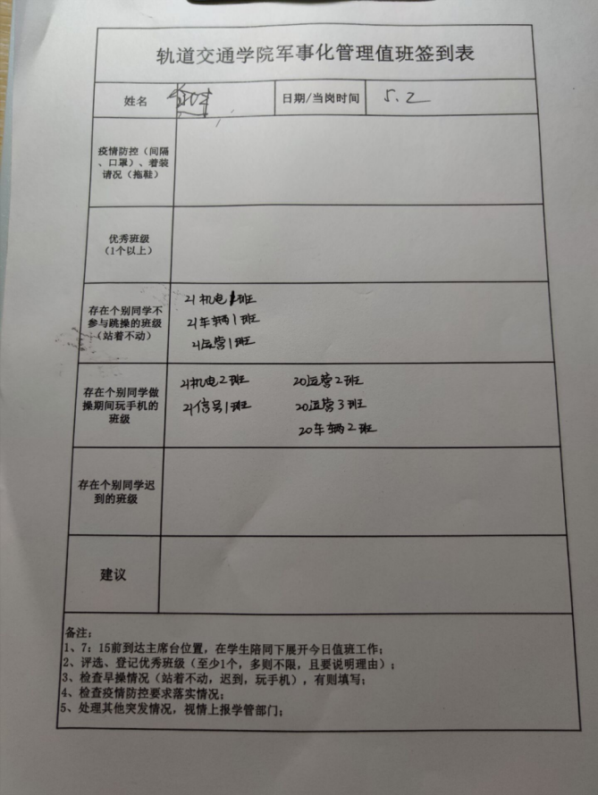 值班记录:今日应出操学生936人,实际出操923,出操率为98.61%,较上期增加近1.5个百分点;满勤班级18个,较上期增加6个。今日早操由吴明丽老师主持了纪念“五四”运动暨5月升旗仪式,同学们能够准时到达指定位置,站队整齐、精神状态饱满。仪式首先由焦航同学领学的《新时代中国青年白皮书》;尔后校党委委员、副校长孙兴林发表的了重要讲话,对同学们提出了三点希望;最后组织了早操训练,整体上参与度高,动作标准,但也存在个别同学着装不规范、跳操不认真、玩手机的情况,在此进行提醒。另外在疫情防控期间,希望同学们能佩戴好口罩。较差班级为21机电1班21车辆1班21运营1班,班跳操参与度不高,个别同学跳操不积极;20运营2班,20运营3班20车辆2班21机电2班21信号1班,有个别同学在跳操期间玩手机。情况反馈:无。