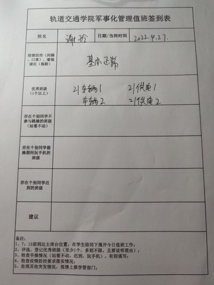 值班记录:今日应出操学生937人,实际出操919人,出操率为98.08%,较上期提高近1个百分点;满勤班级17个,较上期增加六个。考虑到早餐减免政策,及学校作息时间的调整,从今天开始早操时间调整到七点十分,希望同学们能注意时间,准时到达指定位置,避免迟到现象发生。较好班级为:21车辆1班,21车辆2班,21供电1班,21供电2班,跳操积极性高且动作较统一,整体表现较好;较差班级为:20运营2班,20运营3班,20工程班,20机电1班,20机电2班,班级内有个别同学不参与跳操,20车辆2班有七人迟到,出勤率最低,为82.50%,请辅导员做好引导。情况反馈:20级前期跳操较好,后期不动人数多。