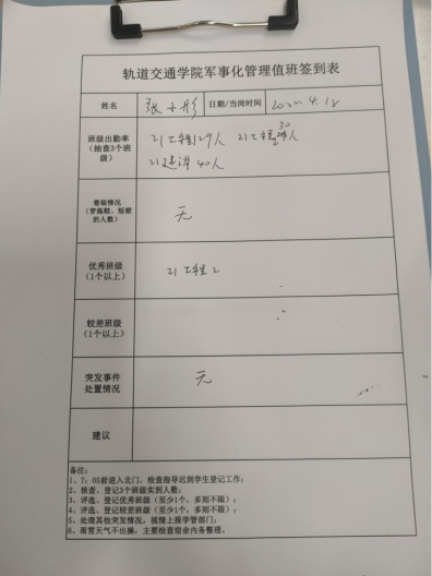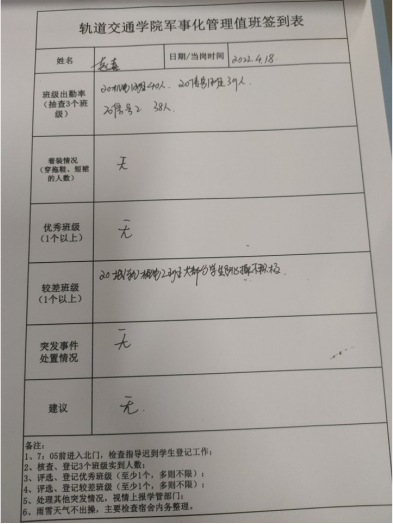 值班记录:今日应出操学生937人,实际出操916人,出操率为97.8%,较上期提高1.1个分点;满勤班级13个,较上期少1个。今日由赵喜老师组织了周升旗仪式,同学们都够准点集合完毕,全程庄严肃穆,效果好。同时进行了文明教室评选活动,21信号2班、21工程2班、21机电2班获得了红旗流动班级。早操整体较好,迟到现象有所好转,兔子舞整体水平提高明显,较好班级为:21工程2班,出勤率高,精神状态好,跳舞整齐;较差班级为:20机电2班,大部分同学跳操积极性不高,请抓好教育。情况反馈:无