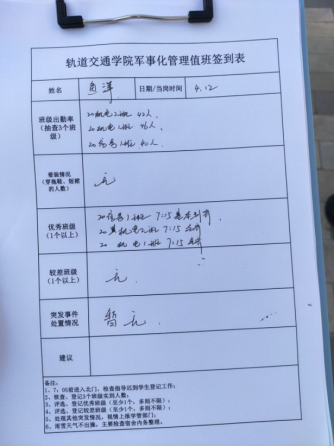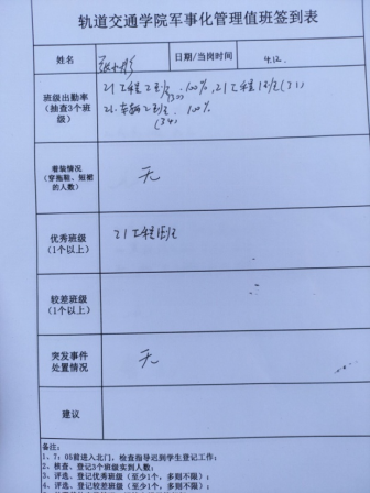 值班记录:今日应出操学生941人,实际出操924人,出操率为98.2%,较上期上升0.4个分点;满勤班级18个,较上期多3个。今日早操吴明丽老师组织了21级自选舞的评比,各班展现出了较高的参赛水平;20级组织了自选舞的训练。较好班级为21工程1班、20机电1班、20机电2班能够提前集合站队。较差班级为:21运营1班,出勤率仅为79.55%,连续两天出勤率低于90%。情况反馈:无