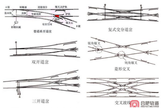 道岔按用途和平面形状分为普通单开道岔、单式对称道岔(双开道岔)、三开道岔、交叉渡线、复式交分道岔等几种类型。